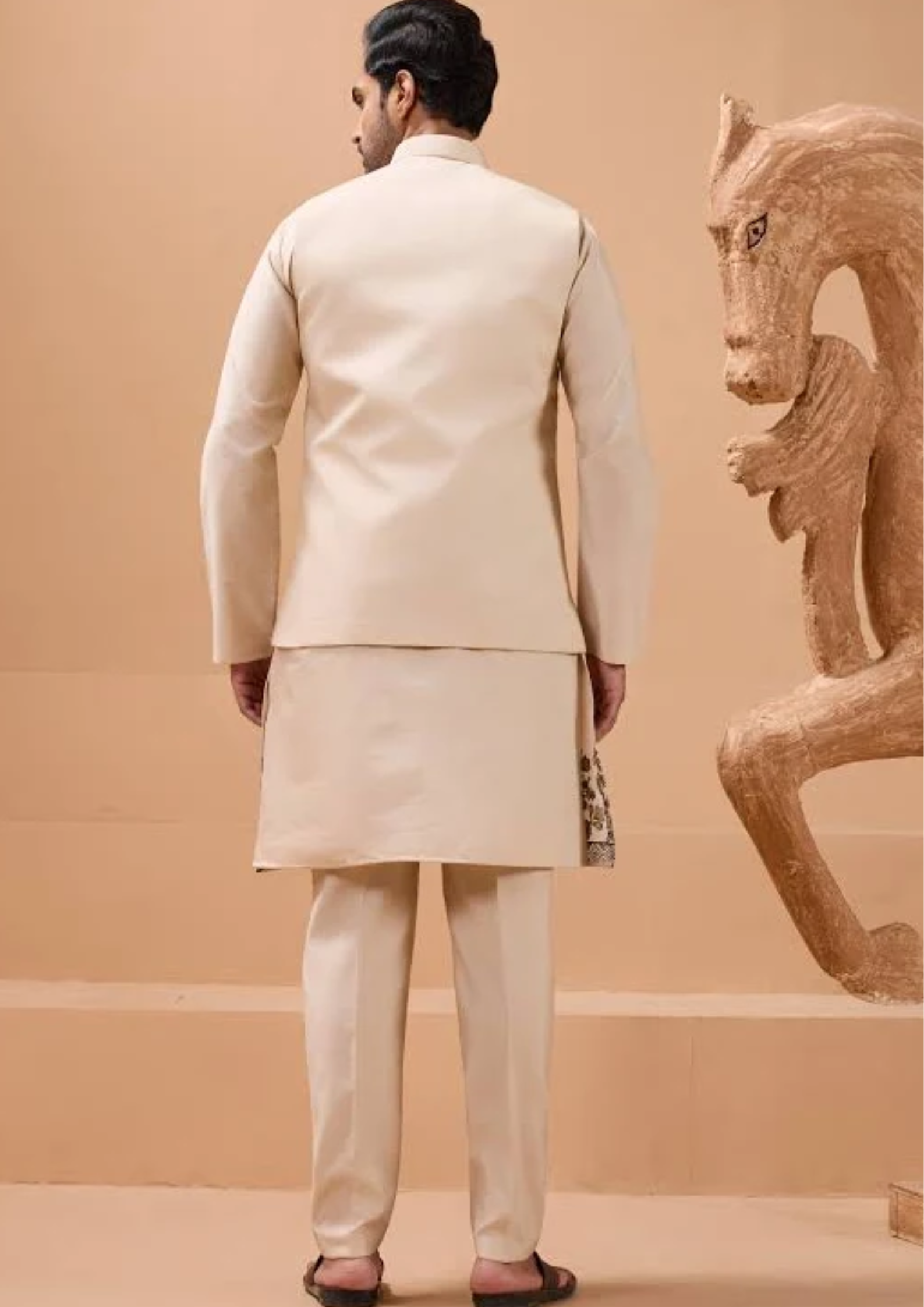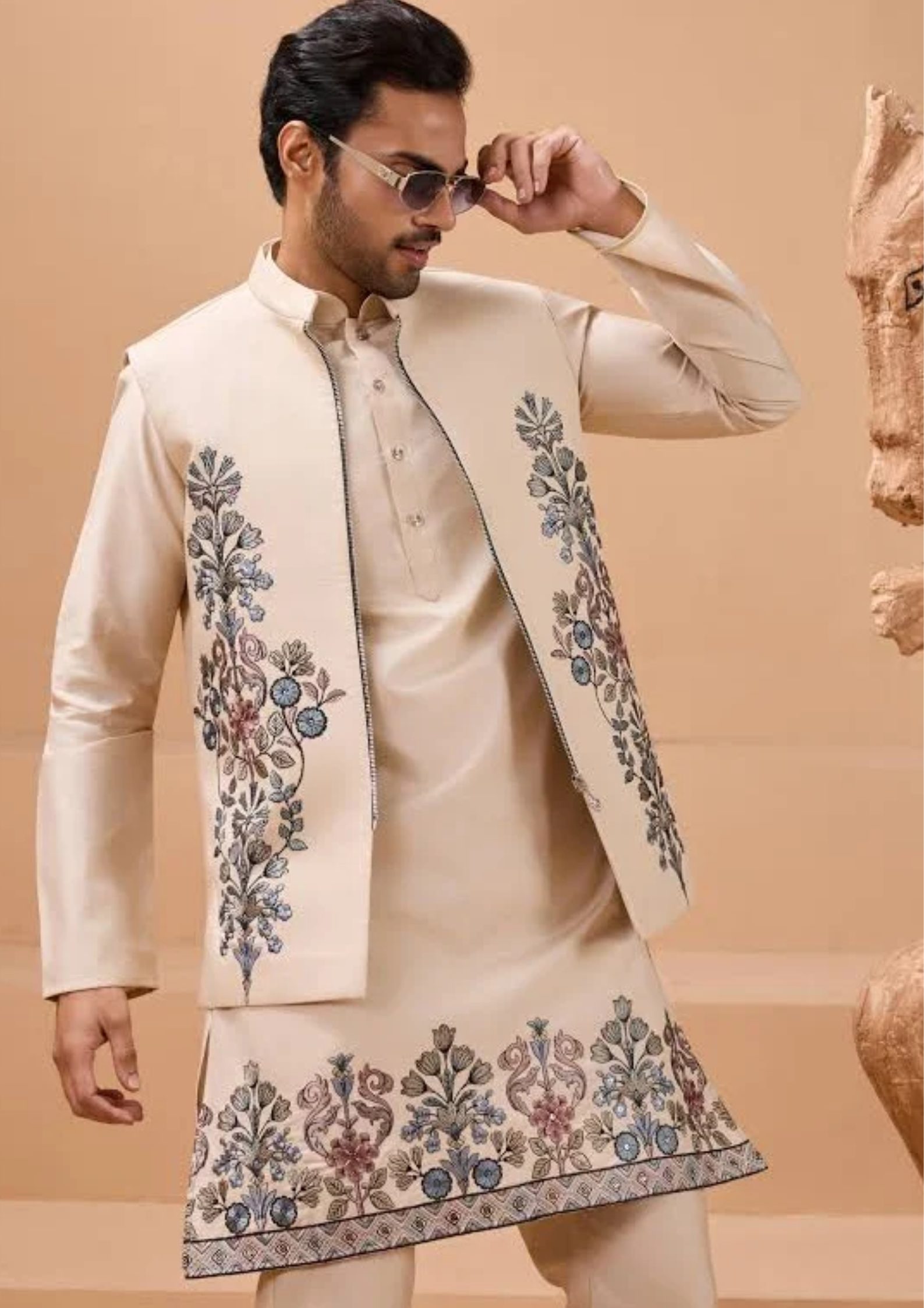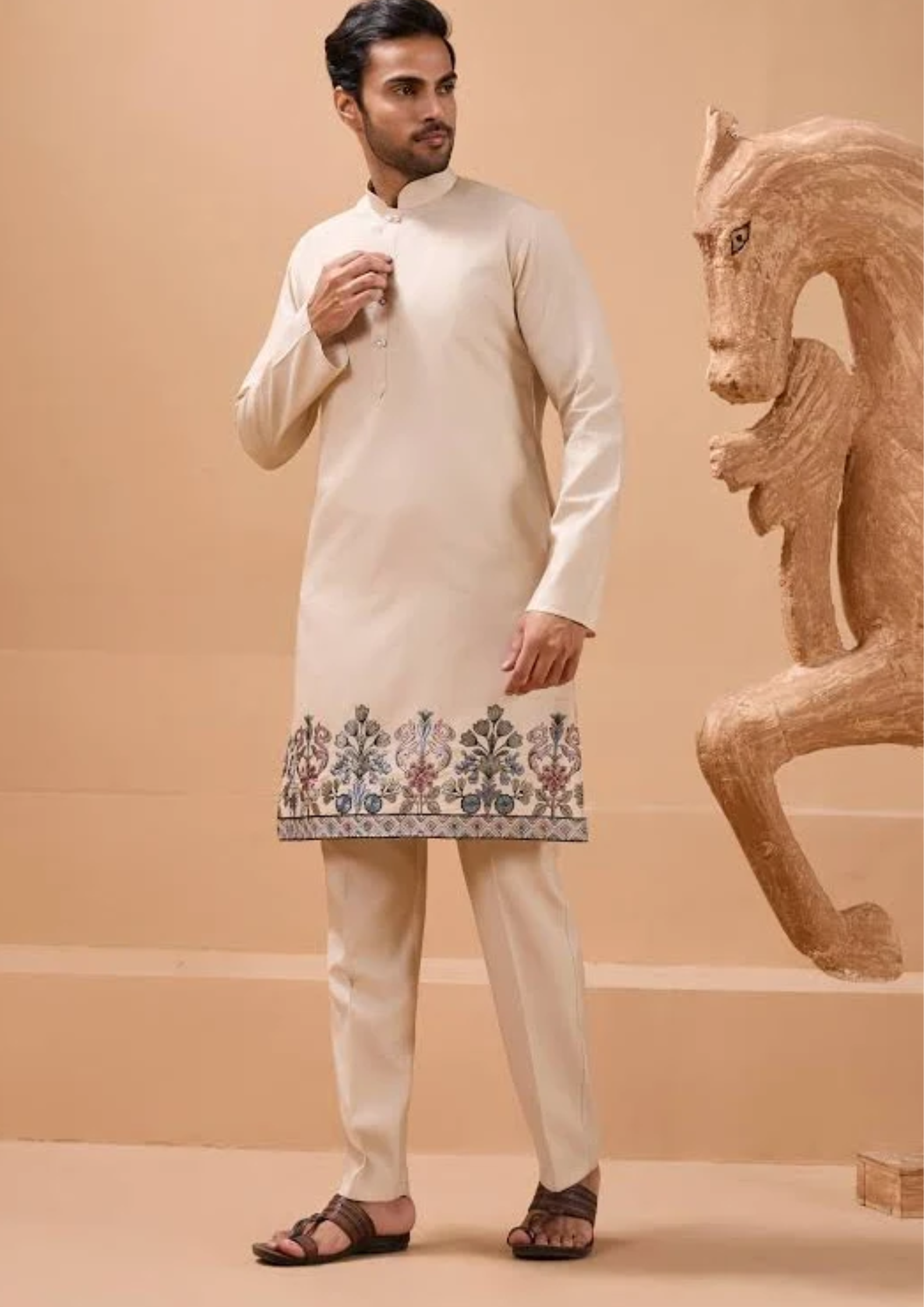 This elegant beige embroidered kurta set is perfect for weddings, festive occasions, or cultural celebrations. The kurta features intricate floral embroidery on the chest and along the hem, creating a stunning traditional look with a contemporary twist. The fabric is soft and comfortable, making it ideal for long hours of wear. The set comes with a matching pant and is designed to make you stand out at any special event. Pair it with traditional footwear or sandals to complete the look. A sophisticated yet trendy choice for modern men who appreciate fine craftsmanship and style.