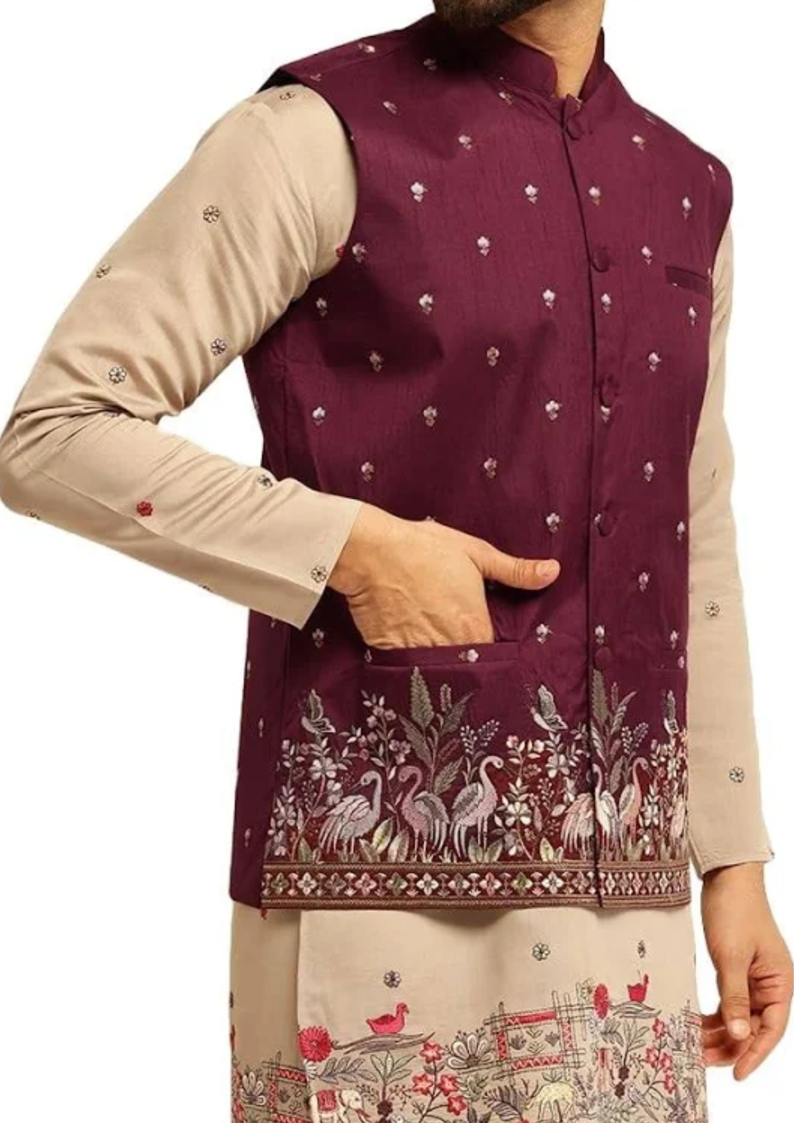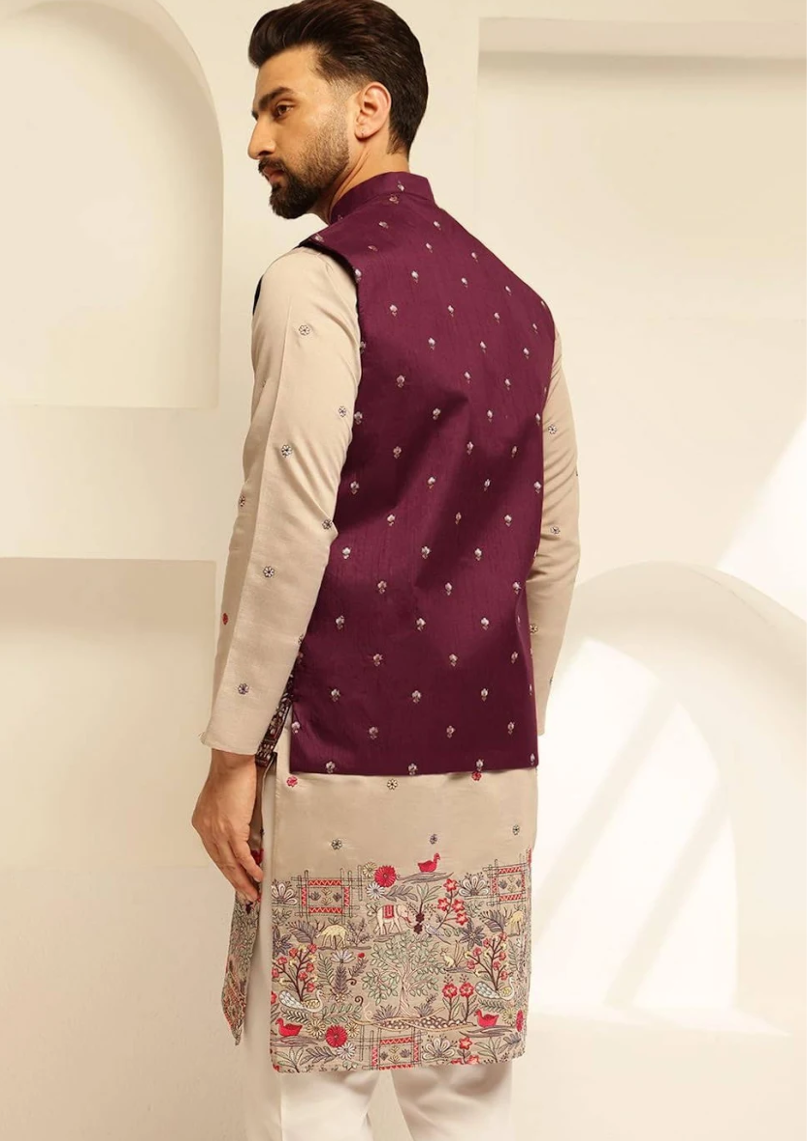 This sophisticated maroon and beige embroidered kurta set is a stunning choice for weddings, festive events, and other cultural occasions. The maroon kurta features exquisite floral embroidery at the hem, complemented by subtle, intricate beadwork that enhances its elegance. The beige sleeves add a modern touch while maintaining traditional aesthetics. The matching off-white pants complete the look, offering comfort and style. Whether you’re attending a celebration or a special gathering, this outfit promises to make you stand out with its refined and fashionable appeal. Pair it with traditional sandals for a perfect finishing touch.